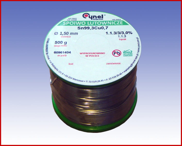 Spoiwo lutownicze S-Sn99Cu1 (LC99M1) Ø1,5 ma zastosowanie głównie w przemyśle elektronicznym, do produkcji urządzeń i podzespołów elektronicznych, do lutowania kąpielowego elementów obwodów drukowanych, elektrotechnice oraz lutowania precyzyjnych elementów
