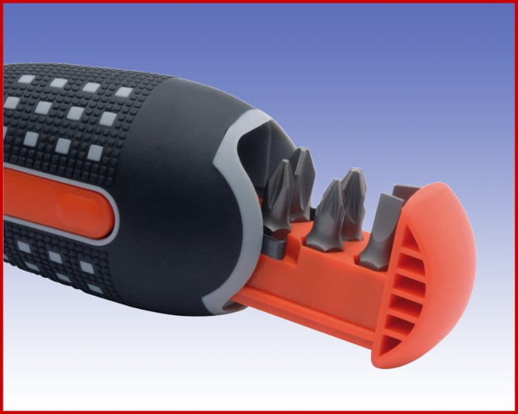 Wzór: Radełkowany trzpień zapewnia lepszą kontrolę pracy końcówki w czasie szybkiego obracania, wyjmowany i chowany w rękojeści magazynek z bitami z przyciskiem zwalniającym. Końcówka trzpienia z magnesem utrzymującym zarówno bit jak i śrubę.