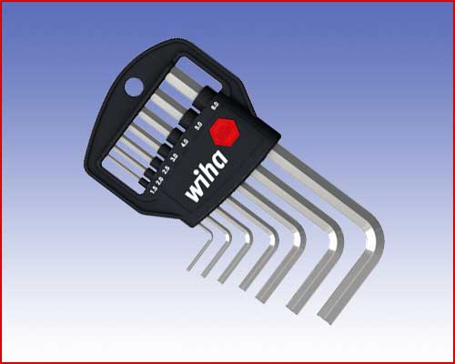 Zestaw kluczy trzpieniowych sześciokątnych w uchwycie.