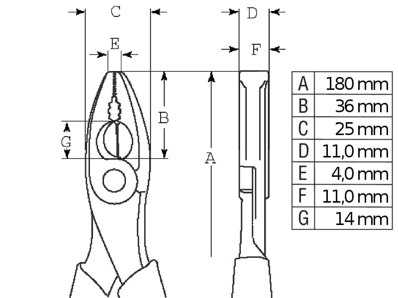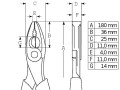 Wzór: Szczypce czernione, odporne na korozję, Złącze “otwarte”, w którym odległość od środka złącza do krawędzi tnących jest zmniejszona. Dzięki większej dźwigni łatwiejsze jest cięcie grubszych detali z twardszych materiałów.