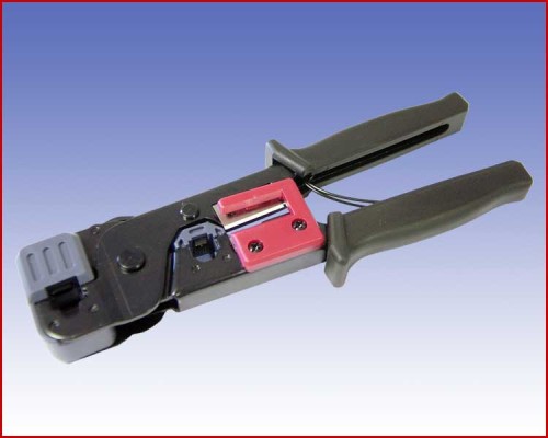 Bardzo dobrej jakości zaciskarka do wtyków modularnych, wyposażona w ściągacz izolacji oraz obcinaczkę do kabli. Metalowe wykonanie wraz z wytrzymałymi plastikowymi rączkami zapewniają trwałość. Posiada system równomiernego zaciskania wszystkich pinów we wtyku.