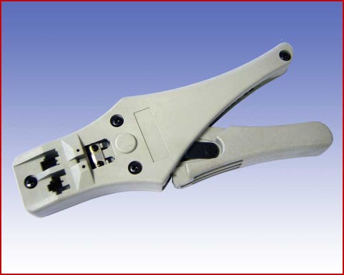 Zaciskarka do wtyków modularnych, wyposażona w ściągacz izolacji oraz obcinaczkę do kabli. Plastikowa wytrzymała obudowa. w celu zaciśnięcia wtyku 4P należy umieścić specjalny ogranicznik we wtyku 6P.