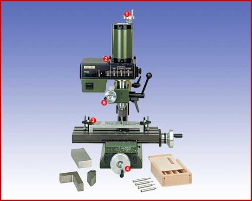 Wysokość ustawiana przy pomocy pokrętła ręcznego używanego także jako dokładny posuw przy frezowaniu (1 obrót=1mm). Tuleję łożyskową wrzeciona i wrzeciennik można zablokować, co jest wygodne podczas frezowania. Mocny silnik napędza urządzenie przy pomocy paska klinowego dając wysoki moment obrotowy szczególnie przy niskich prędkościach. Zaciski 6, 8 i 10mm w zestawie. Stabilny blat roboczy z teowymi wpustami, zgodnie z normą MICROMOT 12x6x5mm.