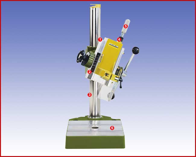 Głowica z precyzyjnie frezowanymi prowadnicami typu jaskółczy ogon, może być odchylana do 90°. Do różnych rodzajów obróbki: wiercenia pod kątem, wielostronnego frezowania bez specjalnych frezów, frezowania pod kątem. Możliwość zmiany posuwu manualnego na precyzyjny. Ustawianie głębokości przy pomocy tarczy z podziałką. Mechanizm zębatkowy posuwu zapewnia wiercenie bez wysiłku. Prowadnica o średnicy 45mm i długości około 500mm. Przybliżony wysięg 140mm (między prowadnicą i środkiem narzędzia). Skok 65mm. Frezowana, wytrzymała podstawa o wymiarach 200x200mm. Bez dodatkowego wyposażenia można stosować wiertarki o średnicy szyjki 43mm (np. Bosch, AEG, Fein, Metabo, Kress, Black&Decker, Skil).