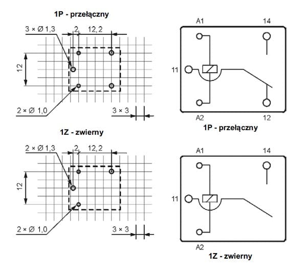 Zestyki: 1P; obciążalność AC1 – 10 A/250 V AC; cewka DC 12 V.