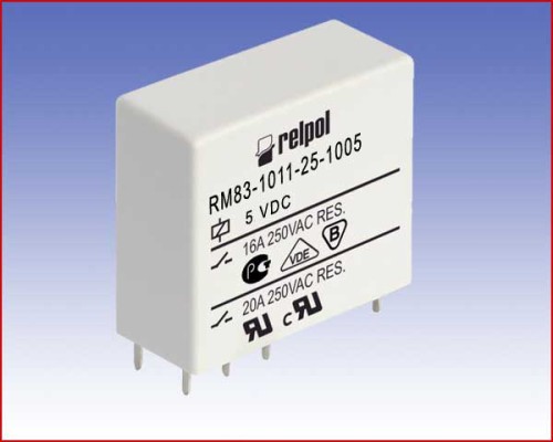 Przekaźnik RM83 1P 05 DC, do obwodów drukowanych i gniazd wtykowych Zestyki: 1P; obciążalność AC1 – 16 A/250 V AC; cewka DC 5 V.