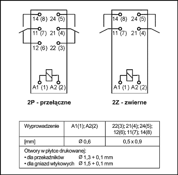 Zestyki: 2P; obciążalność AC1 – 8 A/250 V AC; cewka DC 12 V.