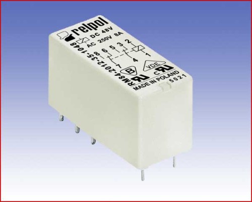 Przekaźnik RM84 2P 48 DC, do obwodów drukowanych i gniazd wtykowych Zestyki: 2P; obciążalność AC1 – 8 A/250 V AC; cewka DC 48 V.