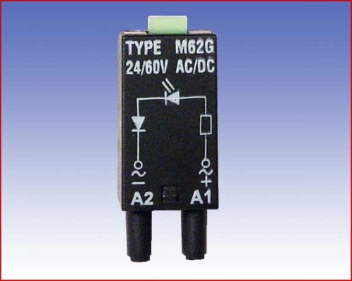Moduł L (dioda: LED zielony) - sygnalizujący. Napięcie pracy: 24...60 V AC/DC. Polaryzacja: (+)A1 - (-)A2. Do gniazd wtykowych: GZM2, GZM3, GZM4, GZT2, GZWR2, GZT3, GZT4, GZM80, GZM92, GZT80, GZT92, GZ96.