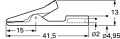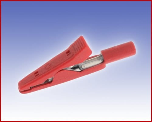Precyzyjny Izolowany krokodylek z gniazdem Ø2 mm, dzięki specyficznemu kształtowi szczęk znakomicie nadaje się do chwytania małych drucików, maksymalny zakres rozwarcia szczęk 7mm.