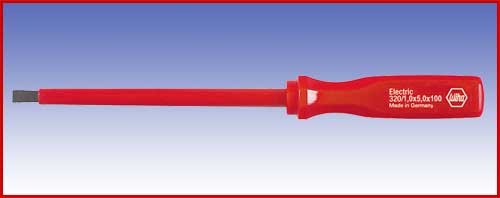 Wkrętak izolowany do wkrętów płaskich, Wiha Clasik electric, 320, 5,0x100. Indywidualnie kontrolowana izolacja ochronna 1000 V AC, znak kontroli VDE i GS.