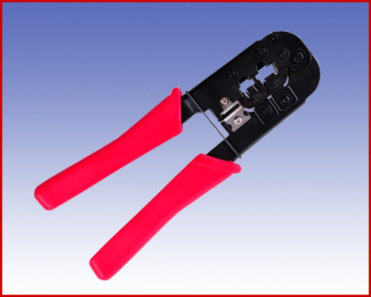 Zaciskarka do wtyków modularnych, wyposażona w ściągacz izolacji oraz obcinaczkę do kabli. Metalowe wykonanie wraz z wytrzymałymi plastikowymi rączkami zapewniają trwałość. Posiada system równomiernego zaciskania wszystkich pinów we wtyku.
